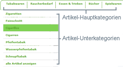 Das Online-Shop Standardsortiment ist in diverse Hauptkategorien inklusive verschiedener Unterkategorien angeordnet.
